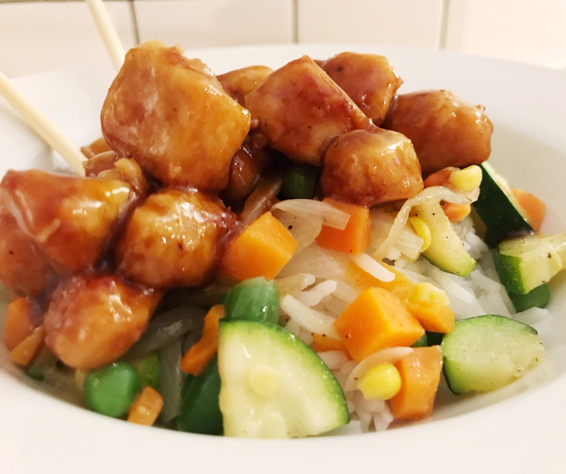This chicken is lightly fried and then tossed in a sweet and spicy sauce. Serve it with cooked rice and sauteed veggies for a super satisfying meal.