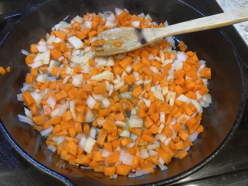 You’ll start by sauteeing the veggies in some olive oil.
