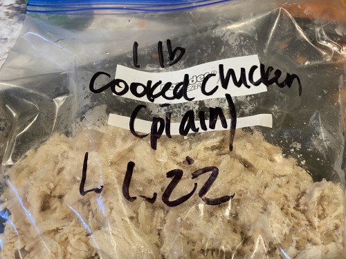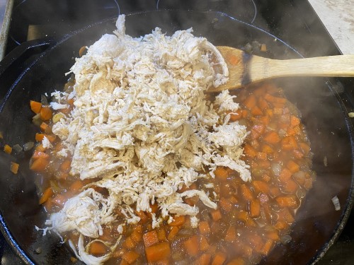 Finally, add in a pound of cooked chicken. I had this in the freezer so just thawed it and threw it in.