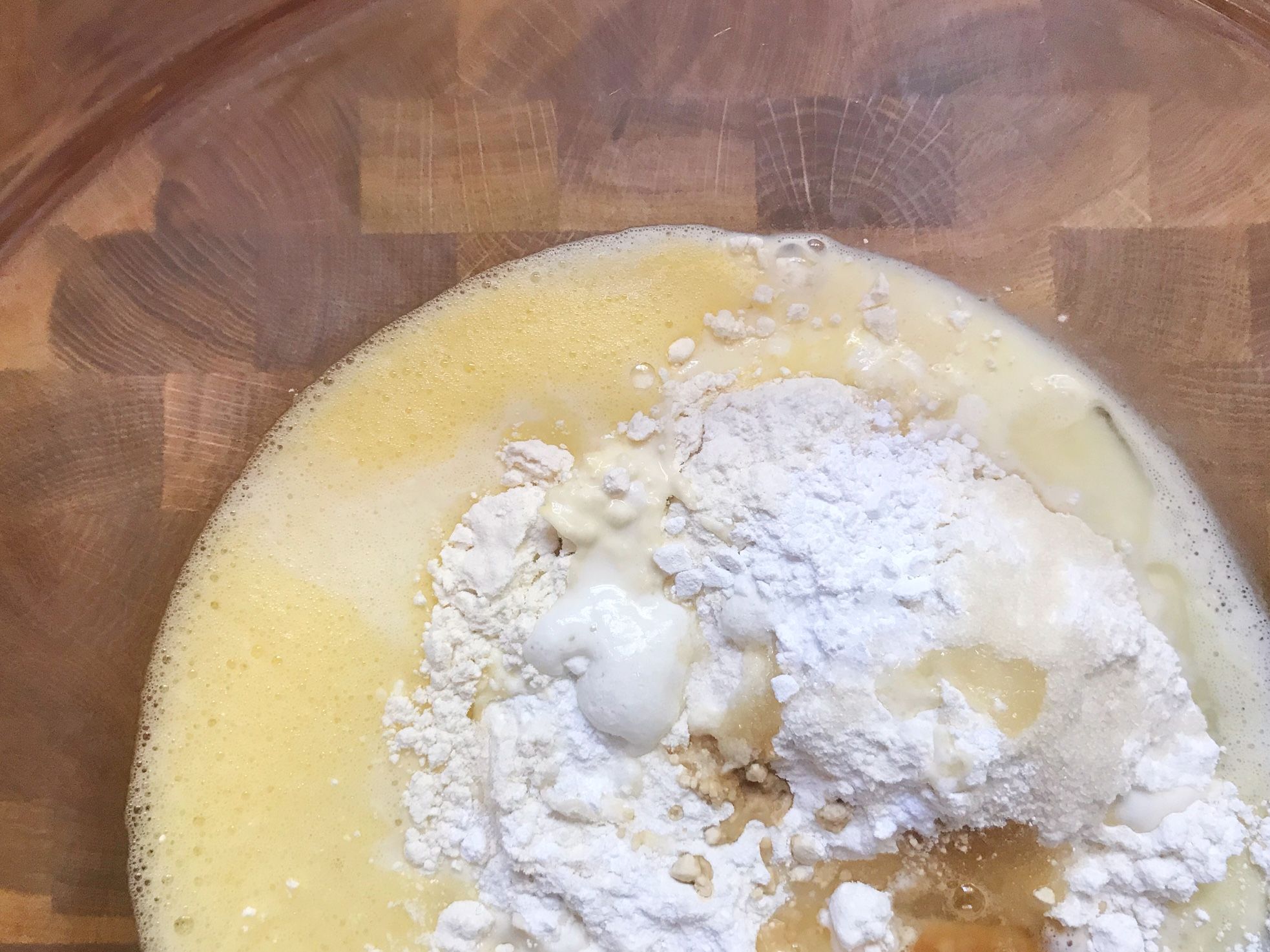 - Add the flour, milk, oil, sugar, salt, baking powder, and vanilla extract and whisk until it just comes together and no large lumps of flour are left.
