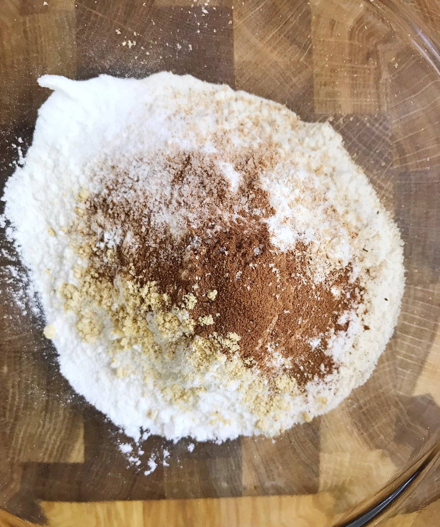 - In a medium bowl, whisk together the flour, cinnamon, ginger, nutmeg, baking soda, and salt and set aside.