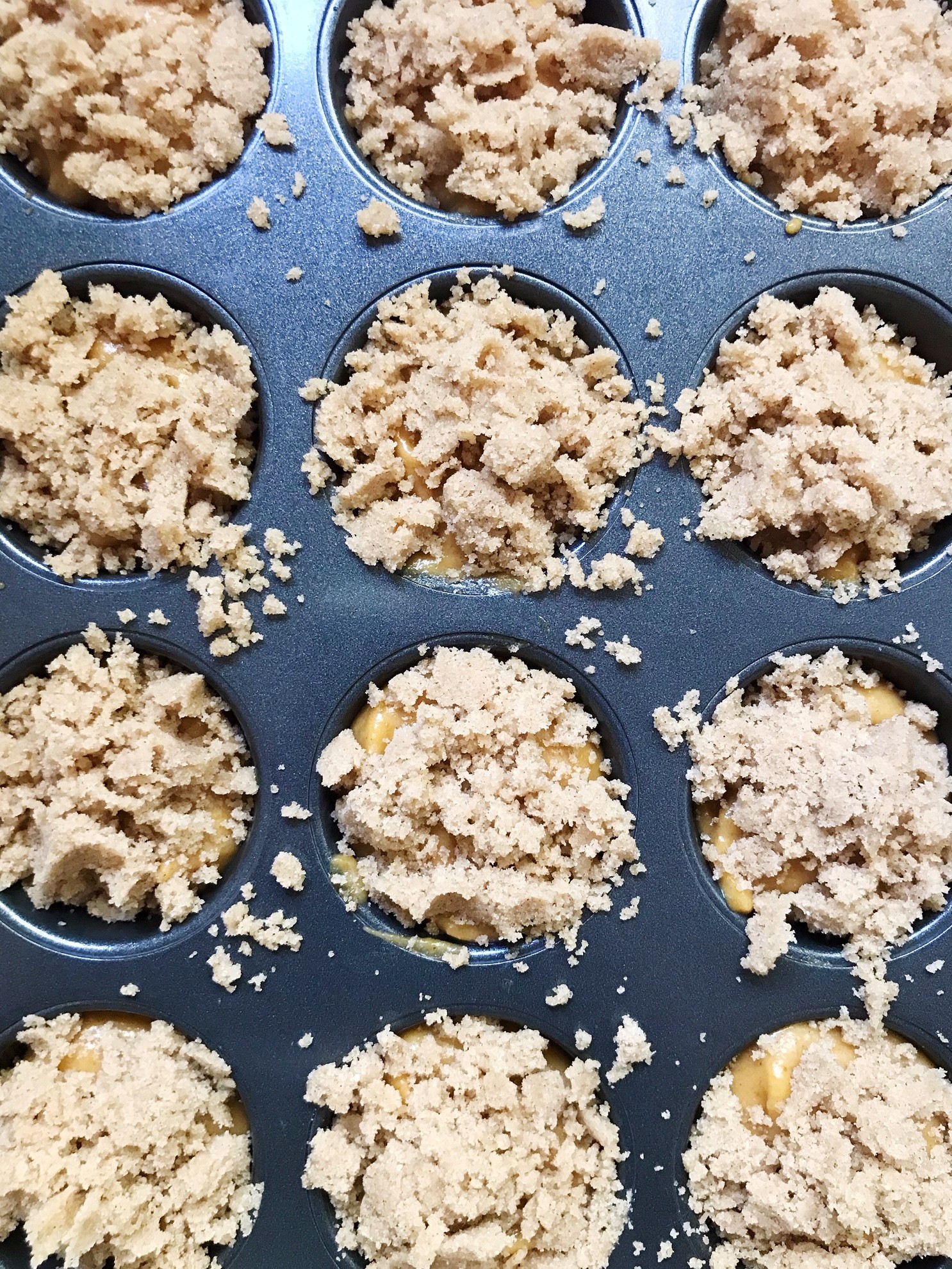 - Fill each space in the muffin tin about 3/4 full. Sprinkle the streusel topping evenly over the batter.