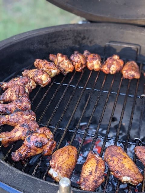 - Place the wings around the edge of the grill (in indirect heat) and allow to cook for 30-50 minutes, flipping once, until the chicken reaches 150 degrees. Note: the timing on this can vary greatly, depending on the temperature in your grill and the size of your wings. A meat thermometer is your friend; start checking the temperature after about 20 minutes to gauge how much time you'll have left.