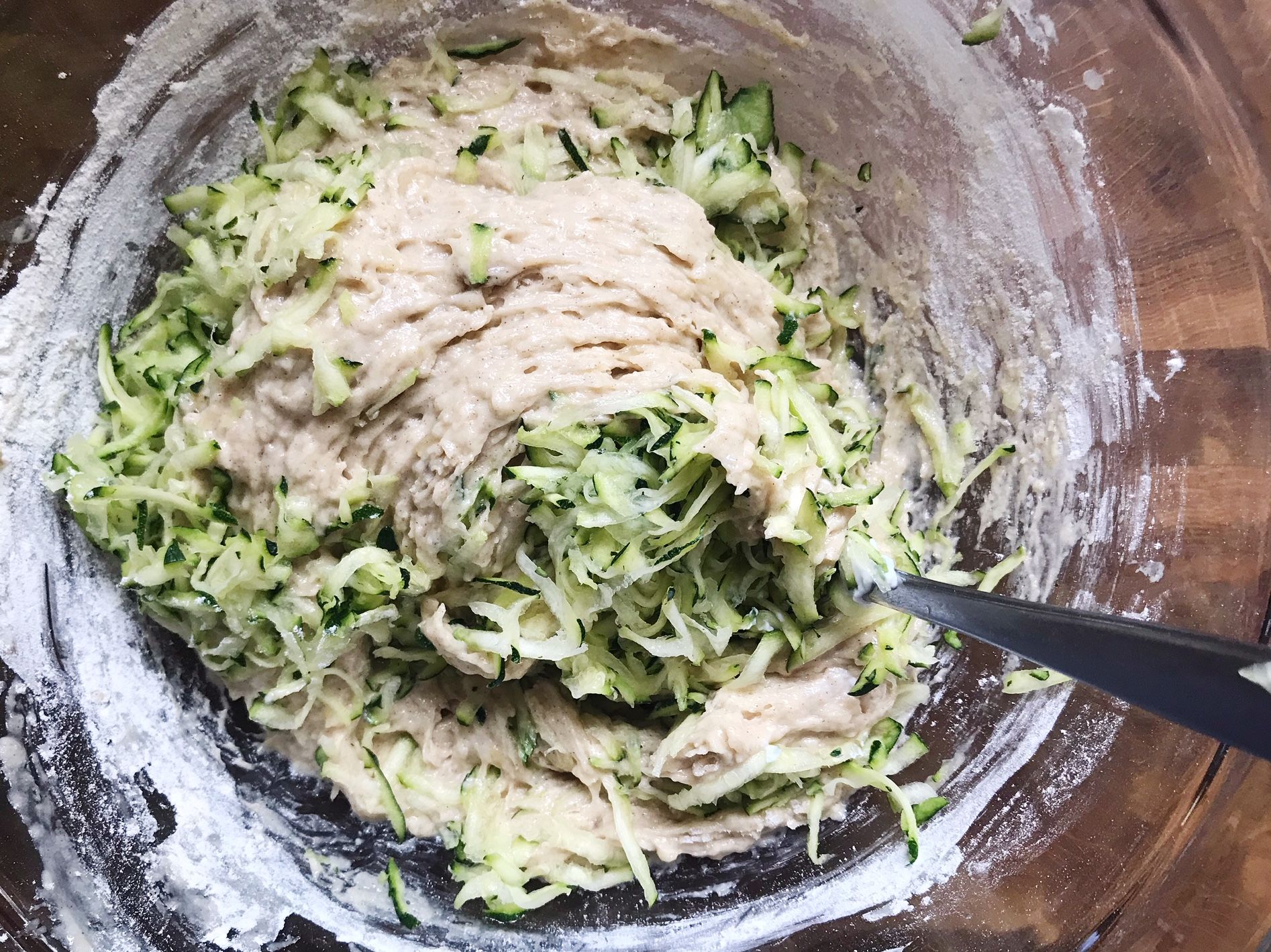 - Sprinkle in the flour and fold until just combined. Add the zucchini and fold until just combined.