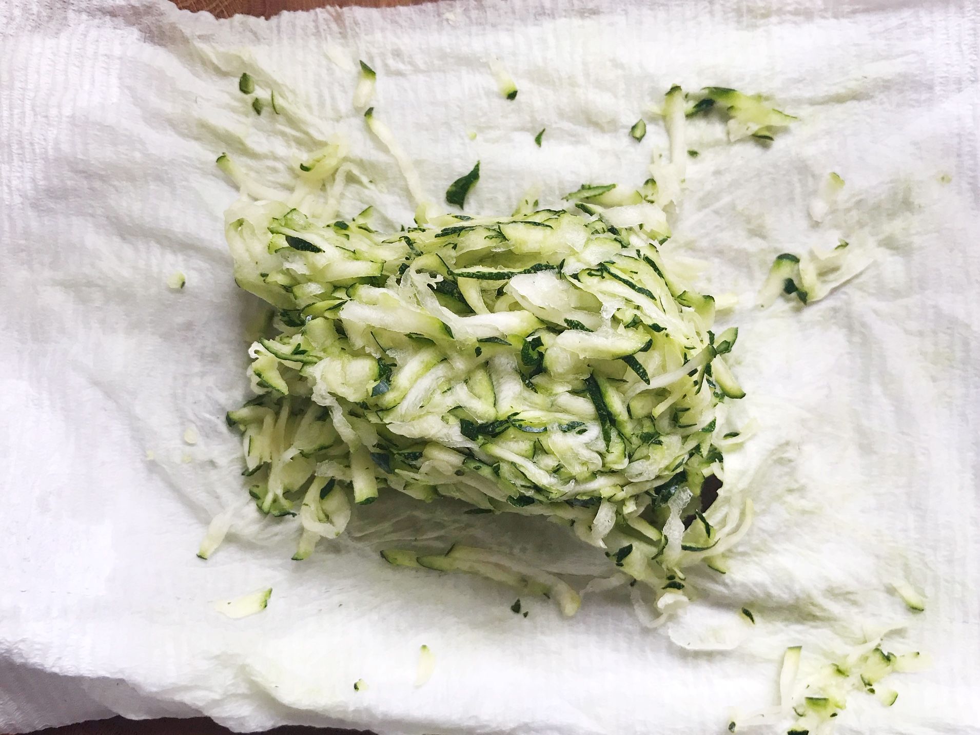 - To remove the grated zucchini of excess moisture, place the zucchini on a layer of paper towels, wrap the towels around the zucchini, and squeeze firmly over the sink. Set aside.
