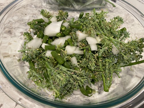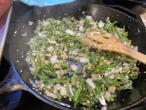 You can use whatever veggies you want! I took green beans and broccoli from our garden. Add the onion, green beans, and broccoli to the pan and cook until the vegetables are tender, about 8 minutes. Add salt and pepper to taste.