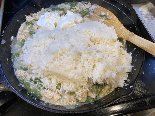 - Add the cooked chicken and rice to the pan along with the sour cream and stir to combine. Sprinkle the top with shredded cheese and place the pan in the oven. Cook until the cheese has melted and the casserole is bubbly, about 12-15 minutes.