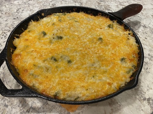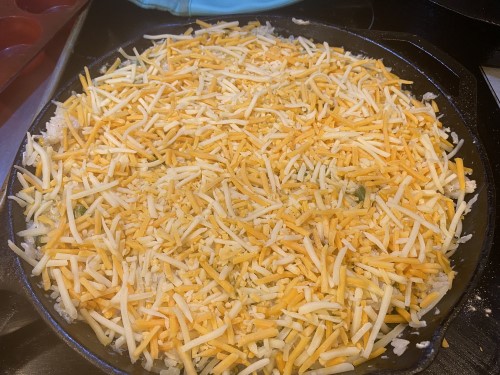 Sprinkle the top with shredded cheese and place the pan in the oven. Cook until the cheese has melted and the casserole is bubbly, about 12-15 minutes.
