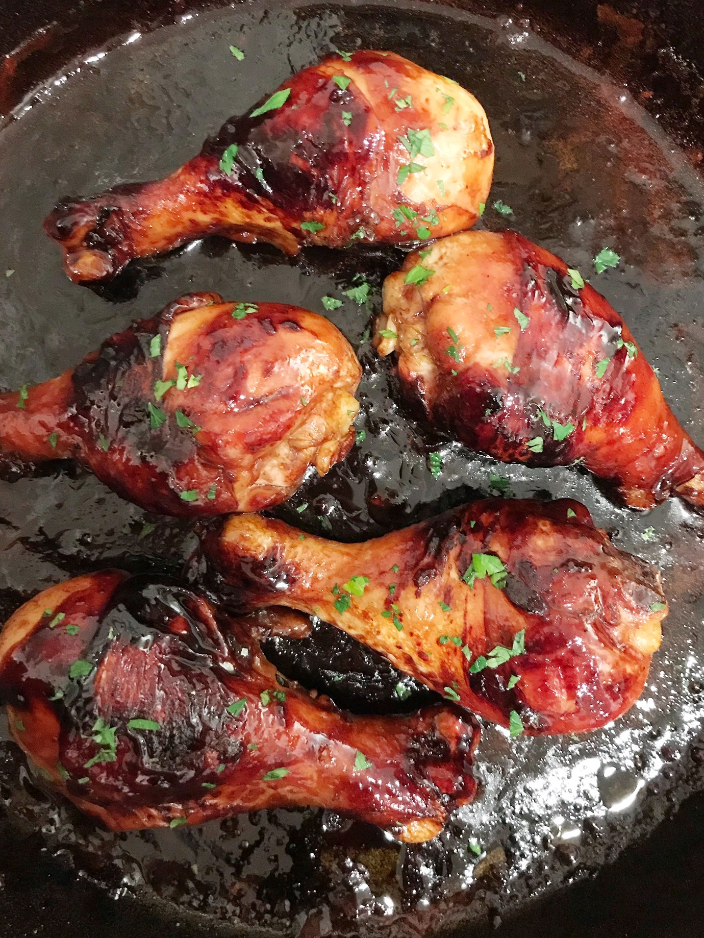 - Set an oven-safe skillet over medium-high heat on the stove (you want it to be hot enough to sear the chicken skin). Place the drumsticks in the skillet and reserve the marinade. Brown the chicken, turning to brown all sides (about 7 minutes total).