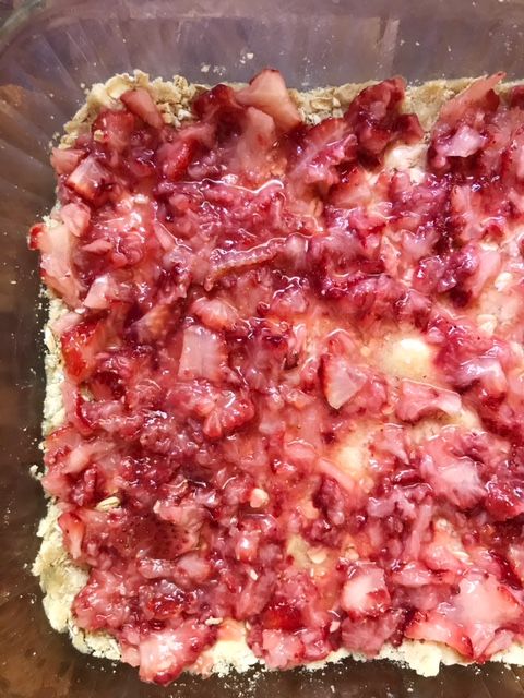 - Add half of the flour mixture to the prepared pan and firmly press down. Spread the strawberries over the top. Sprinkle the remaining flour mixture over the top of the strawberries and gently press down.