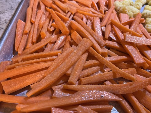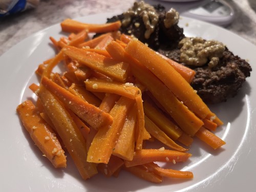 I prefer them to be thinner (so do my kids in braces) so I decided to try carrot fries! They were good the first time, but then I started adding garlic and it took them over the top. If you don’t like garlic, they’re still good without!
