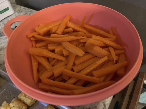 The first step is to peel, wash, and slice the carrots. I usually the carrots in half and then cut each of those sections into fry shapes.