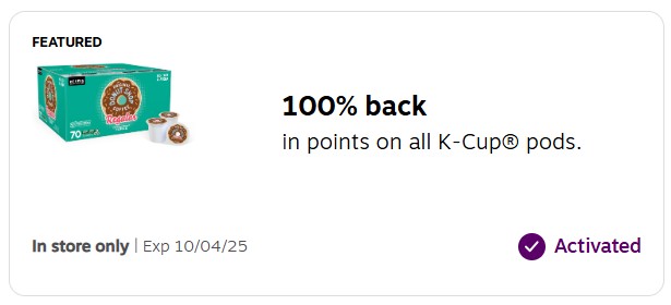 Head to your local store, grab some K-Cups, and get back 100% in rewards credited to your account. Use it on your next purchase!