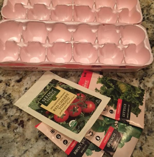 Once the seeds sprout turn your egg carton 180 degrees every 1-2 days to keep the plants growing straight (they will bend towards the light naturally). After 2-3 weeks your plants may need to be moved to larger containers. If that happens save used yogurt containers or even use plastic bathroom cups to give them more soil and room to grow. For most of us though we’ll only have another 2 weeks before they can go outside.