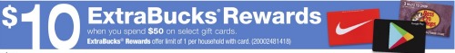 Get $10 ExtraCare Bucks when you buy $50 in select gift cards. The cards pictured in the ad are Nike, iTunes and Bass Pro Shops. Typically one or two other cards will be part of the sale too.