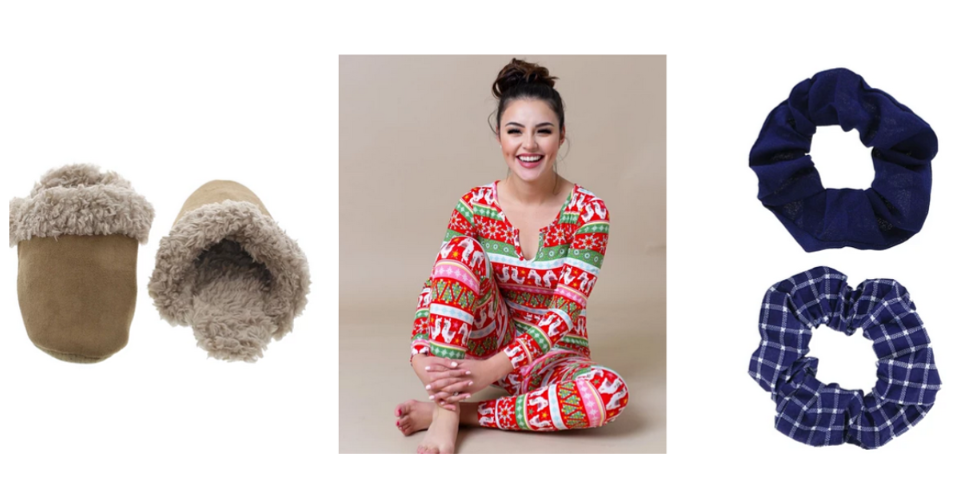 Choose from slippers, onesie pajamas and two scrunchies. There are several patterns and colors available for each. Go ahead and grab your size!