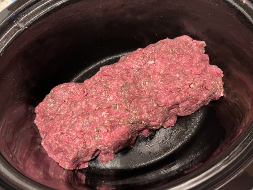 Spray the slow cooker with cooking spray, and shape the meat into a loaf and place inside.