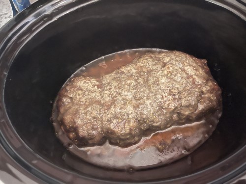 You can also place the meatloaf on a trivet if you want to avoid the grease at the bottom, but since I was using lean meat I didn’t drain any of the grease off. I slice it into pieces in the slow cooker and serve from there.