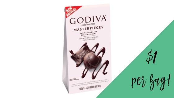 Here’s a hot deal on Godiva Masterpiece pouches. There is a Catalina deal going on right now for use on a future purchase. You should be able to use a coupon on each bag, which makes them only $1 each after Catalina!