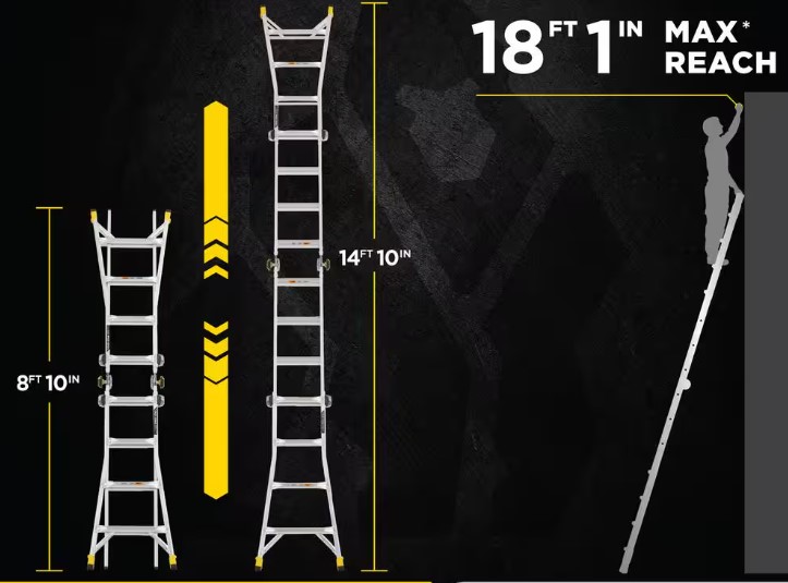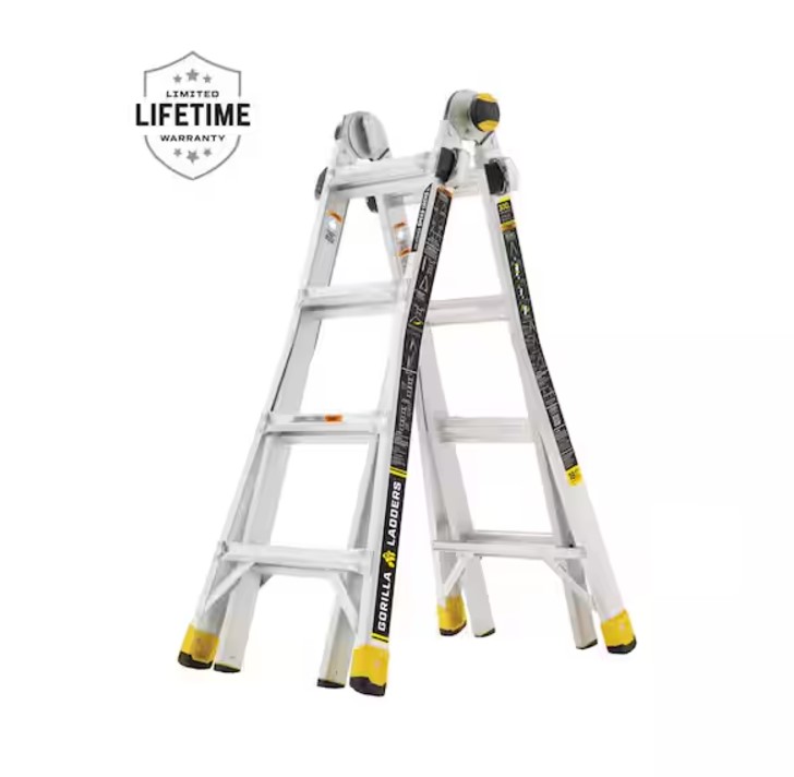 This Gorilla Ladder has 20 adjustable telescoping positions from a twin step ladder, stairway, 90 degree, and extension and 3 additional scaffold positions with available accessories.