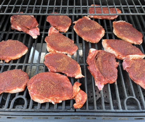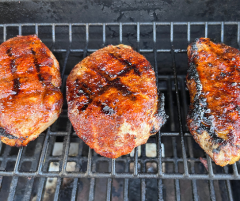 - Once the grill is hot, oil it. Use your hands to press the rub into both sides of the pork chops and place on the grill.
