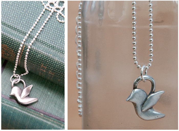 The birdie on this chain is hand molded and hand cast in fine pewter. It is strung on an 18 inch sterling silver plated chain. This necklace can make for a great gift.
