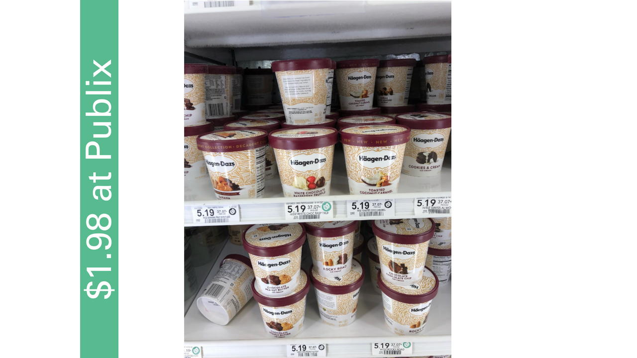 - Publix – Haagen Daz Ice Cream 14 oz or Bars, 9 oz, B1G1 at $5.31 ($2.65)
