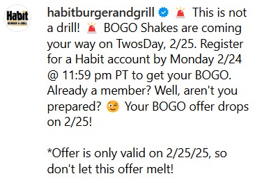 Home > Dining Coupons > Habit Burger B1G1 Handspun Shakes Today Only, 2/25