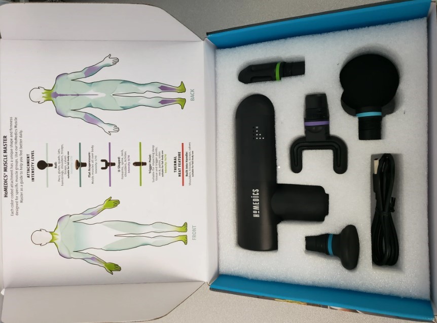 The box includes (1) HoMedics Therapist Select Compact Percussion Massager, (1) Storage Bag, (4) Attachments and (1) USB-C charging cord. A handy chart explains the use of each attachment.