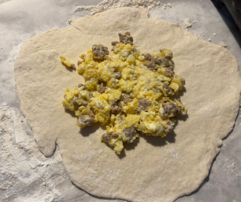 You can use any filling, but for these breakfast hot pockets, I used a pound of breakfast sausage that I cooked ahead of time, 4 oz cream cheese, 10 eggs (1 per hot pocket), and a cup of cheddar cheese.