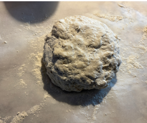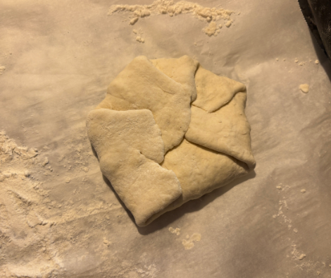 Once it’s totally combined, take it out of the bowl and put it on a floured surface (I used parchment paper).