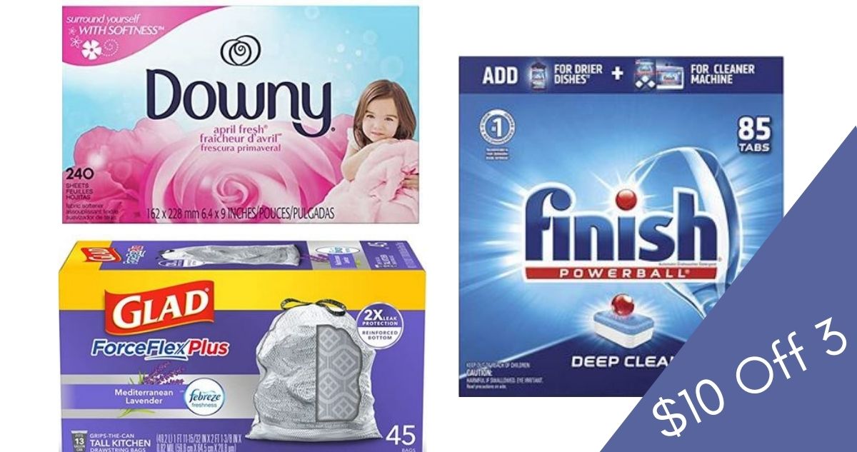 Get $10 off (3) participating items on Amazon. This is a great way to save on popular household products including Glad trash bags, select Method products, Finish tablets and more.