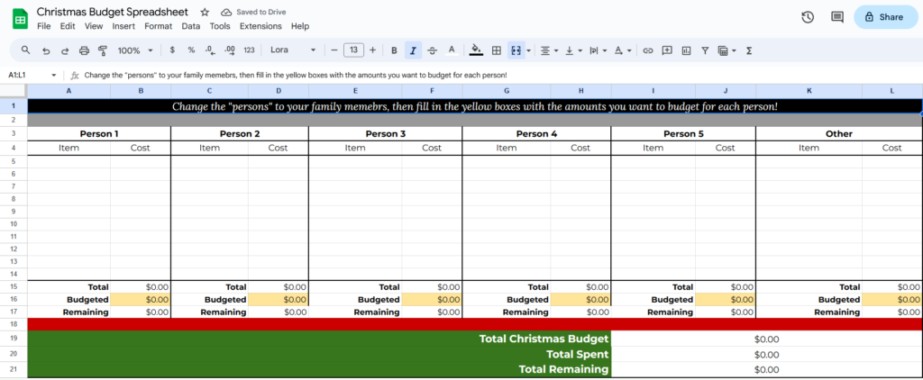 This will of course vary from family to family. But this is especially important if you have multiple kids! Parents want to be fair and sometimes when we shop early we don’t think about how much we’ve already spent over time. For example, I bought several gifts for my kids on Prime Day in June, but if I hadn’t kept track I might go ahead and spend all the money I’ve allocated for them all over again. You can also budget for how much you’ll spend on teacher gifts, Christmas pajamas, or other special Christmas activities.