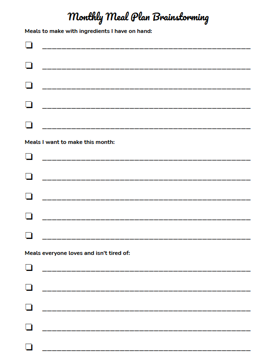 - Ask your spouse and/or kids if there is something they’d like to eat this month. Sometimes they remember meals I’ve forgotten about!