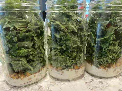 The next step is to decide what kind of salad you want to make. I chose to try Budget Bytes’ kale salad with cajun spiced chickpeas and buttermilk dressing. This is a salad I’ve loved before and I was in the mood for, so I wanted to try to modify it into a mason jar salad.