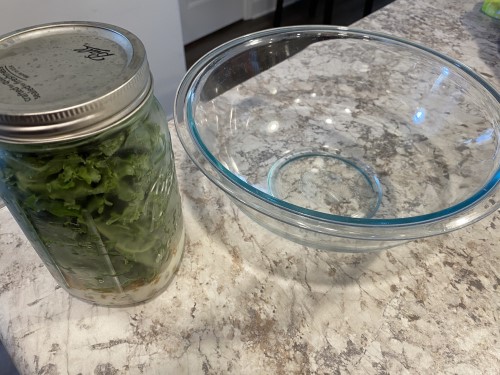 When it comes time to eat the salad, you’ll need a nice big bowl. Because I packed this salad so tightly, I had to use a spoon to get all that kale out!