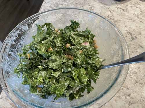 I put the onion in first, then added the chickpeas and the parmesan. The chickpeas covered all of the dressing, so they’ll keep it away from the kale.