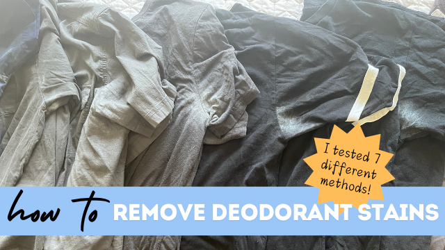 The Internet has many ideas and suggestions. Some are preventative, like using certain kinds of deodorant and limiting how much deodorant you use. I shared this information with my husband, but I still had to figure out what to do with these shirts. I decided to attempt a low-key science experiment by taking all the suggestions and trying each one on a different shirt. I then washed them all, dried them, and checked to see which ones worked the best. Stay tuned to see the best way to remove deodorant stains from shirts!