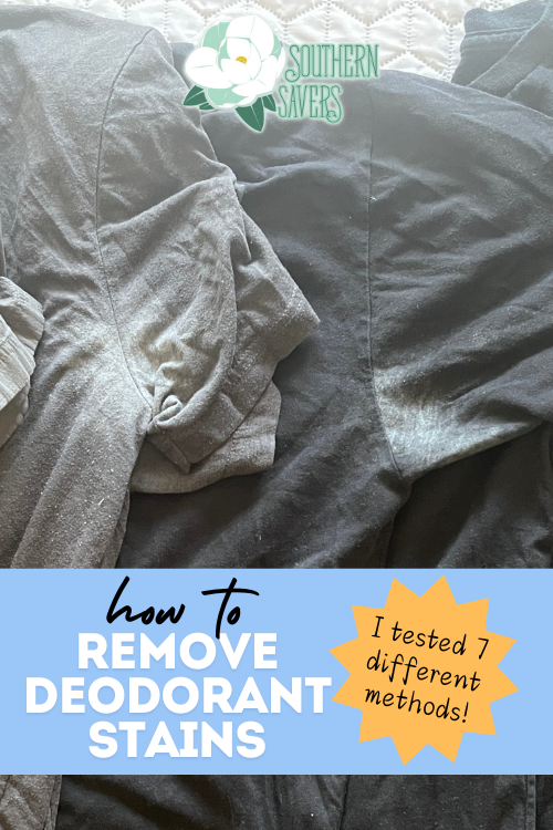 I have a basket in my closet for clothes that need help in some way. It has single socks that I’m hoping I’ll find the match for, shirts that need a new button, clothes with tears or rips, and clothes with stains I need to work on. I realized that my husband had been adding many shirts to the basket, all of which had deodorant stains in the armpits. As the pile grew, I decided I needed to start figuring out how to get those stains out.