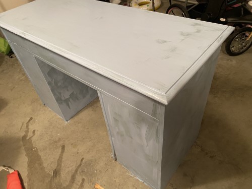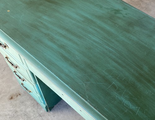 I was worried about the words that had been somewhat engraved into the top of the desk. I wasn’t sure if they would still show through when I painted.