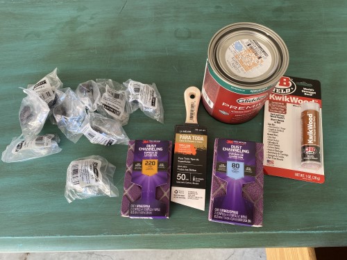 This is the wood epoxy I used. You roll it around in your hand to make it softer, then fill in the holes. It kind of feels like hard modeling clay.