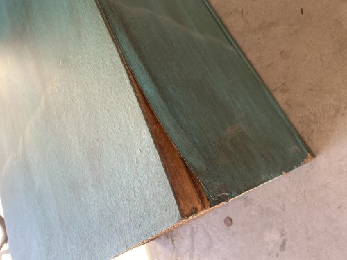 Here’s the desk after the first coat. I was pleased to see that the pencil engravings on the top were not visible after the sanding and the first coat of paint. You can also see the damaged part of the desk in this picture near the bottom right, but again, this part was going to go against a wall once it was inside.