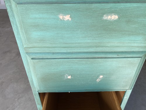 Here is what it looked like when I received it. It looked like someone had attempted to repaint it already but hadn’t finished. Some of the hardware was missing or broken. With my very limited knowledge, I knew that the whole process would be three big steps: sanding / preparing to paint, painting, and replacing the hardware.