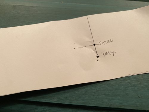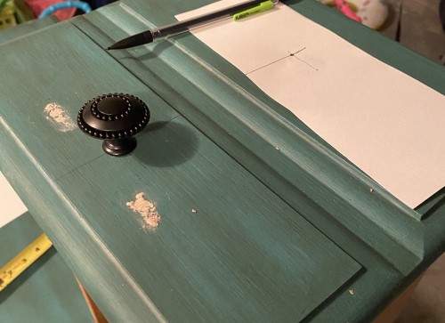 Once I filled in the old holes, it was time to drill new holes. A friend recently redid her cabinets and told me about how she bought a special item that helps you easily measure where to drill holes in cabinets. I didn’t have one of those, but I knew what they were like and decided to make my own. I took a piece of cardstock and used a tape measure to figure out where I wanted to drill the holes in the larger drawers and the smaller drawers. Then I used a pencil to push through it so I could mark on the drawers. On each drawer, I just lined up the corner of my “guide” with the corner of the drawer. Then I marked through with the pencil and drilled the hole on that mark.