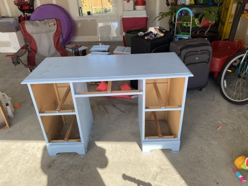 Time to paint! I chose a light blue semigloss paint for the desk that I hoped would look good with the black hardware I picked out. The desk was going to go in a room that is relatively neutral, so I wanted some color, but nothing too flashy.