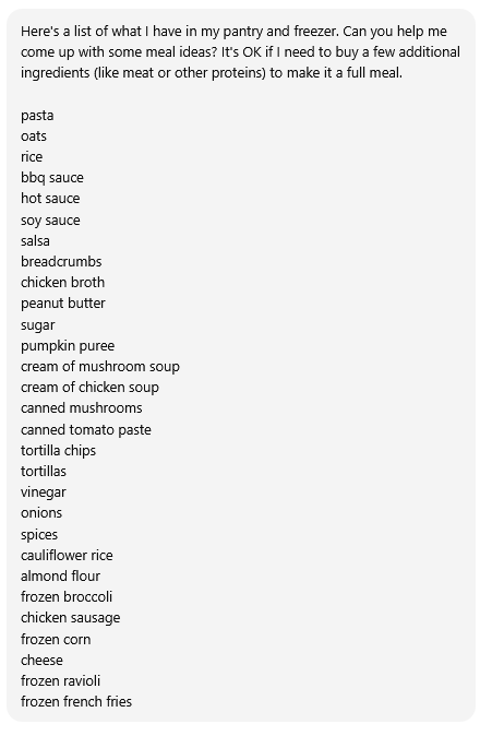 People are using ChatGPT for all kinds of things these days, and I’m finding that one of its best uses is to do things that I could do but that it can do much faster. Meal planning is one of those things—but not just any meal planning. I tried making a list of what your average person might have in their pantry and freezer and asking ChatGPT to make some meals. I was pleasantly surprised at the results! It wasn’t perfect, but it gave me ideas for a few things I never would have thought of. I’m going to share how I did it so you can figure out how to use ChatGPT to plan meals as well.