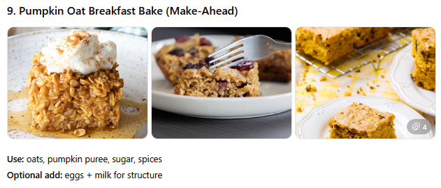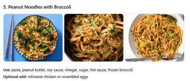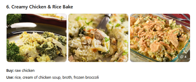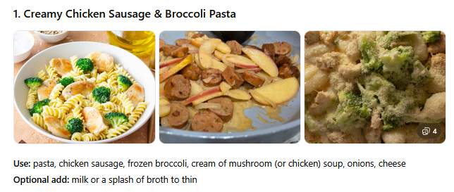 Note that the pictures ChatGPT provided were scraped from recipes it found online. Not all of them are perfect matches with the recipe title.
