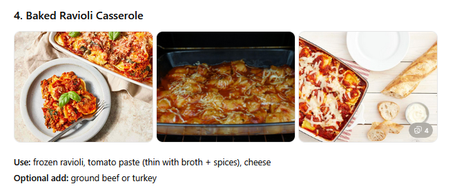 I have done alfredo bakes with ravioli, but this is another idea that I haven’t made in years. This is a great way to use up the frozen ravioli I got on sale at Publix recently. i will say I’m not convinced ChatGPT’s idea to just thin out tomato paste would be enough sauce, but it’s something to start with.
