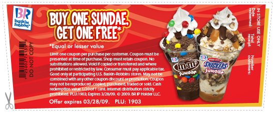 Print this coupon and bring it to your local Baskin-Robbins store to receive one Sundae of equal or lesser value with the purchase of any Sundae.  Good through 03/28. (Thanks Hallie!)