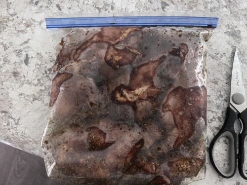 For lack of a better word, “squish” the chicken around with your hands until the marinade has permeated the bag and all the chicken looks like it’s been covered. Then stick the bag in the fridge for a few hours or up to overnight.